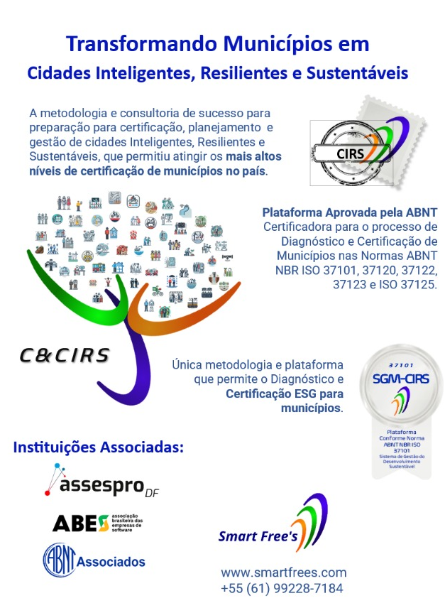 A Smart Free´s foi a consultoria contratada para estruturar e assessorar na obtenção da Certificação do Município de São José dos Campos/SP, o primeiro Município Certificado no Brasil nas três Normas ABNT NBR ISO 37120 (Nível Platina), 37122 (Nível Ouro) e 37123 (Nível Ouro) , com manutenção da certificação elevando os níveis certificados, alcançando os níveis platina nas três Normas no ano de 2024.